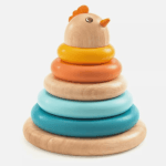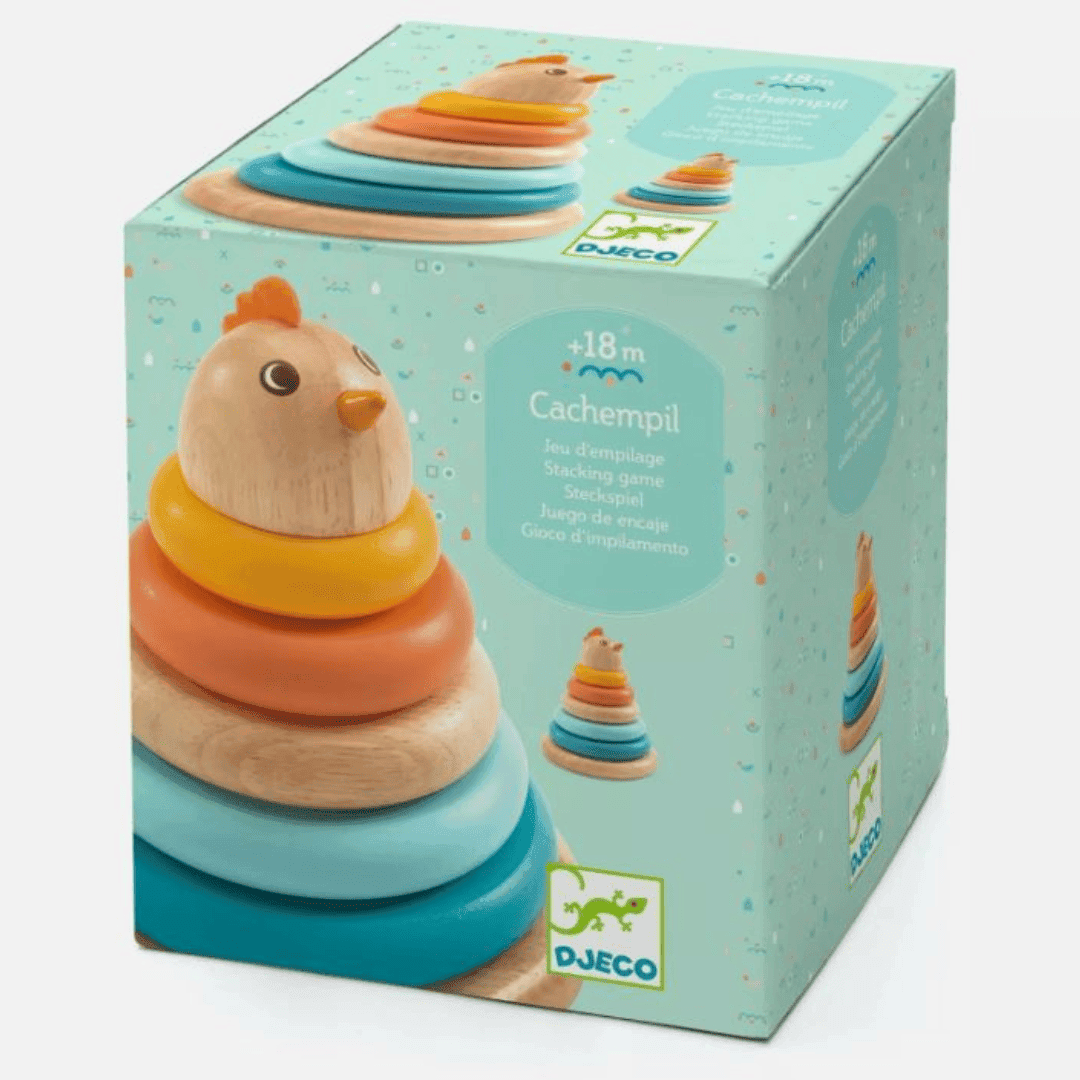 Uma mãe galinha de anéis de empilhar de madeira, com um ovo escondido no fundo. Os seus anéis de cores vivas ajudam os mais pequenos na sua coordenação visual e no reconhecimento de formas e cores, estimulados pela surpresa de descobrir o ovo!
