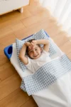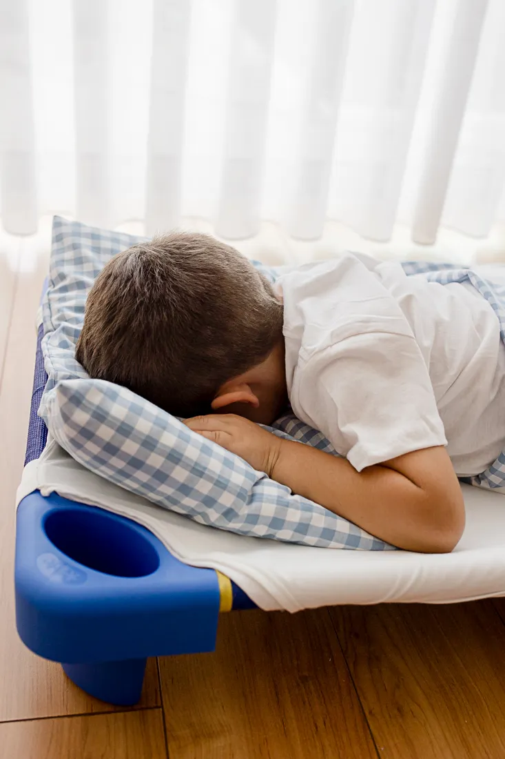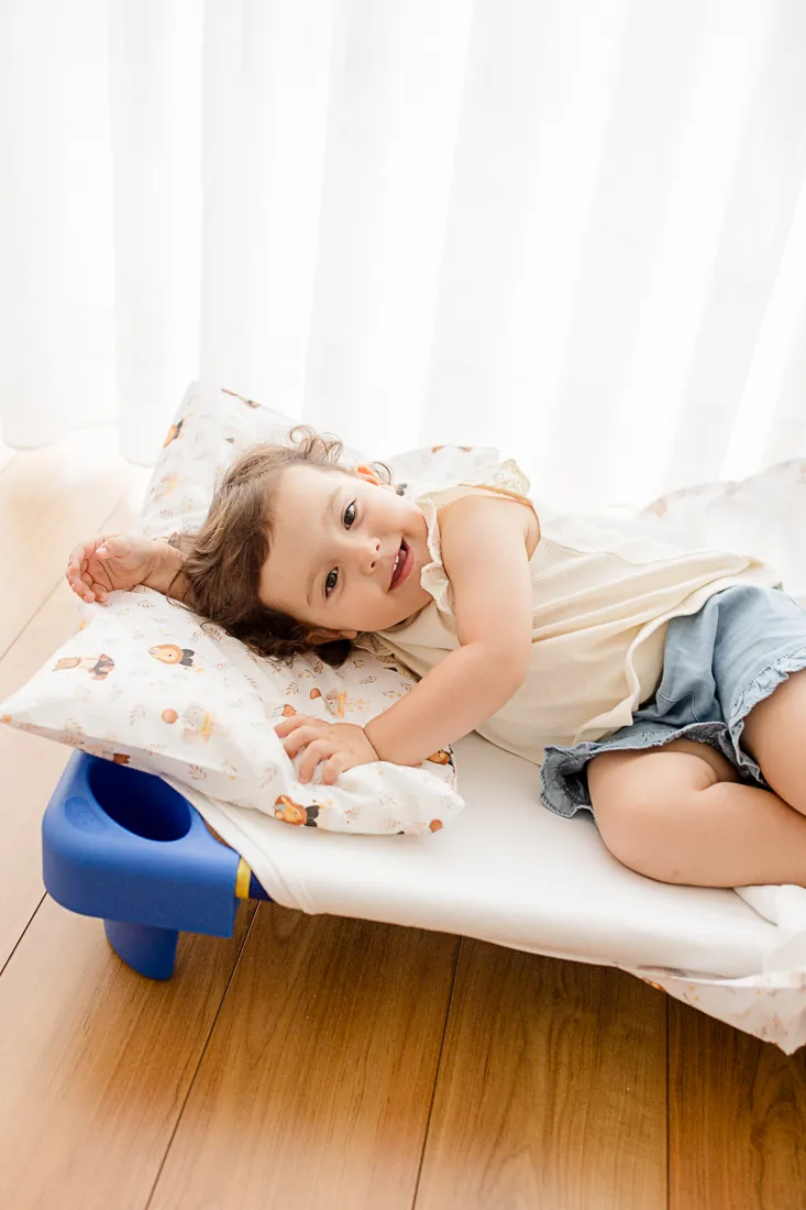 - O recorte nas pontas permite que os catres encaixem uns nos outros mesmo com os lençóis colocados – uma solução prática que facilita a arrumação e a logística da creche.