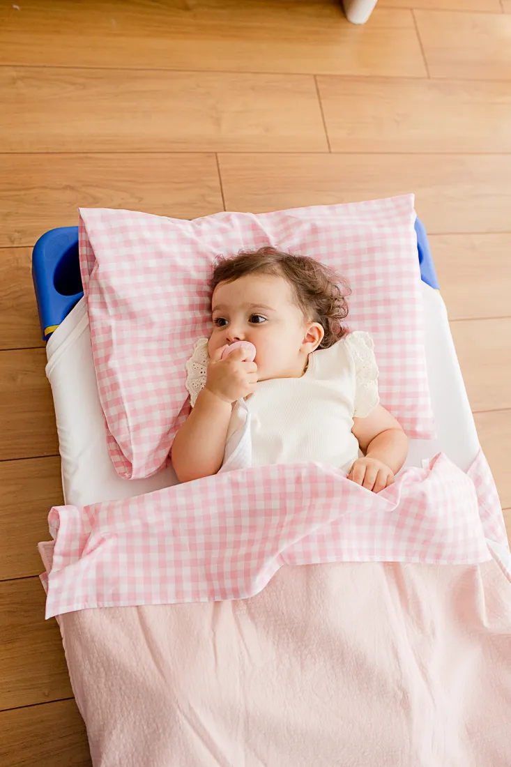 - Contém molas na parte superior, que possibilitam prender a manta da Coleção de Creche Flamingo nos meses mais frios, mantendo o conjunto unido e a criança aconchegada durante a sesta.